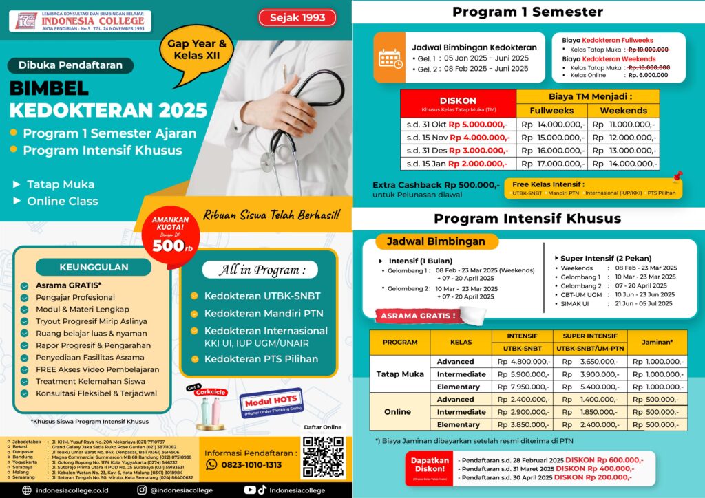 Berbekal pengalaman lebih dari 32 tahun, Indonesia College telah berhasil meloloskan ribuan siswa masuk kuliah kedokteran yang dituju, baik PTN, PTS, maupun International. Mari bergabung bersama kami untuk mengoptimalkan peluang anda, pilih program yang sesuai dan raih SUKSES. Kuota terbatas/exclusive class, pendaftaran akan ditutup apabila kuota sudah terpenuhi, untuk menjaga kondusifitas serta kualitas.