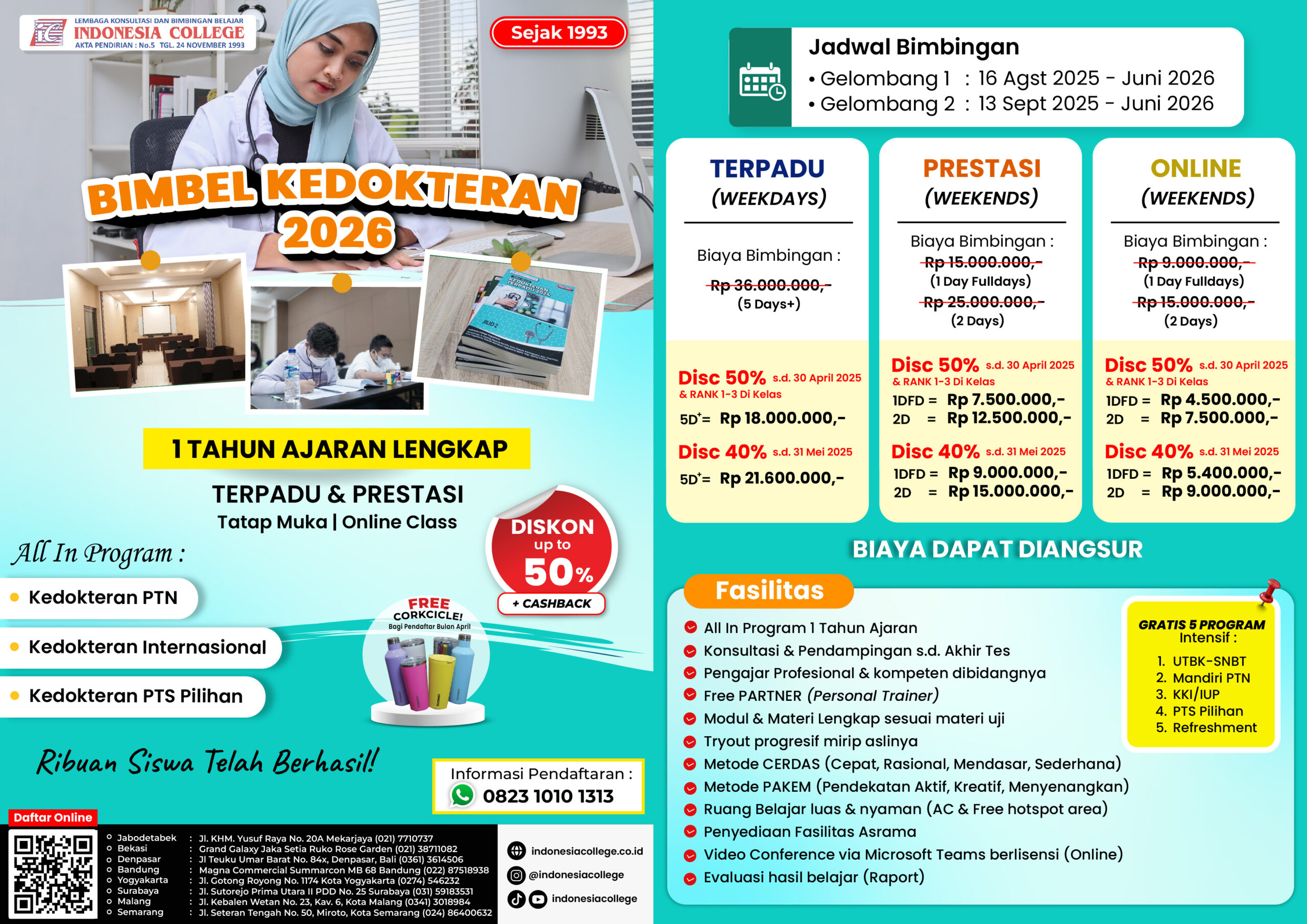 Mari bergabung bersama INDONESIA COLLEGE dalam BIMBEL KEDOKTERAN TERPADU Program Jaminan ! dengan soal-soal prediksi yang sangat akurat, simulasi tes yang sangat mirip, dan yang sangat terarah, dibimbing oleh ahlinya, sehingga peluang diterima maksimal. INDONESIA COLLEGE memiliki kapasitas, kualitas, pengalaman dan layanan yang memadai guna mendukung serta untuk mendampingi Anda meraih sukses dalam seleksi Masuk Fakultas Kedokteran 2026.